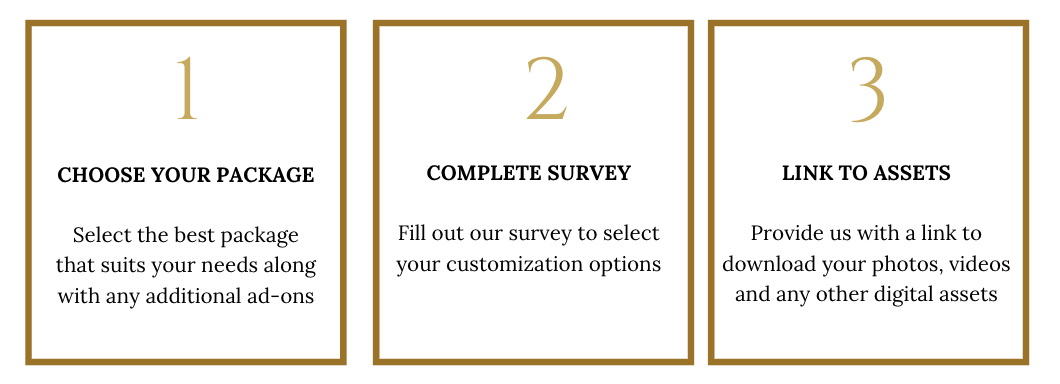 It's very easy. You just provide us with your videos, pictures and any other assets. We discuss your vision and then leave the rest to us. The first draft of your video will arrive in 2-3 business days.